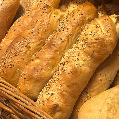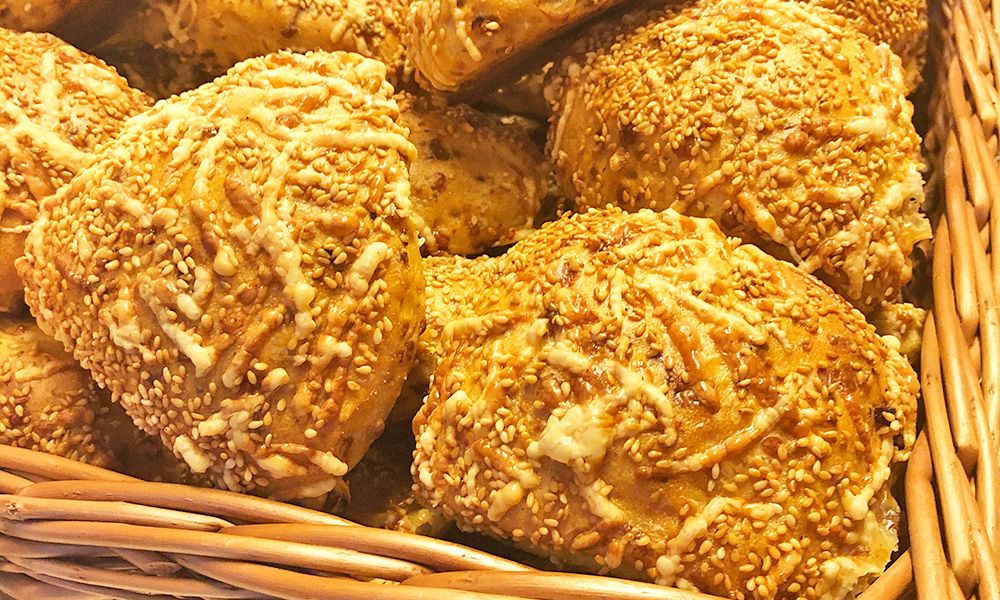 Herzhaft pikante Brötchen aus Weizensauerteig mit Schinken, Paprika, Käse, Zwiebeln und etwas Sesam getoppt.